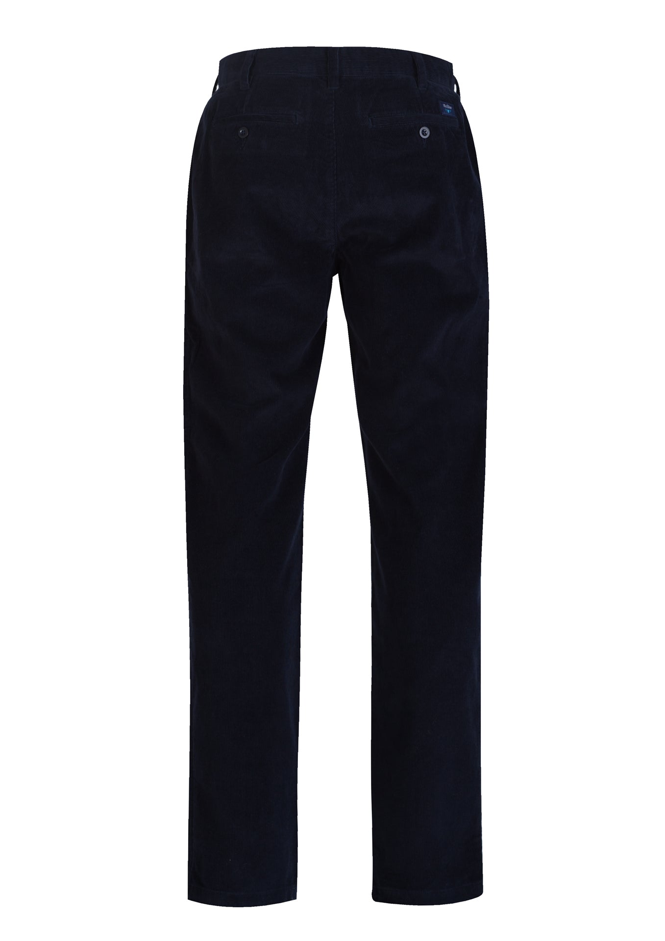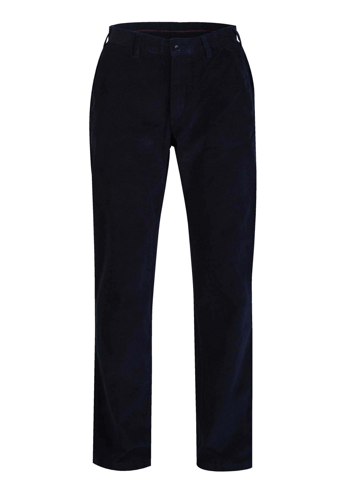Calças 100% algodão bombazina riscas finas azul escuro. Corte regular. carcela com fecho de correr oculto, 2 bolsos laterais, 2 bolsos de ilhós abotoado na parte posterior e presilhas para o cinto. Quente e muito confortável, são a escolha certa para os d
