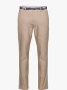 Calças chinos homem 100% algodão camel. Tape no cós em azul marinho e beige. Muito confortáveis, são a escolha certa para os dias mais quentes.