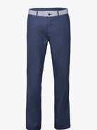 Calças Chinos Homem 100% Algodão Oxford azul denim com detalhe no cós às riscas branco e azul denim. Corte Tailored Fit. Muito confortáveis, são a escolha certa para os dias mais quentes.