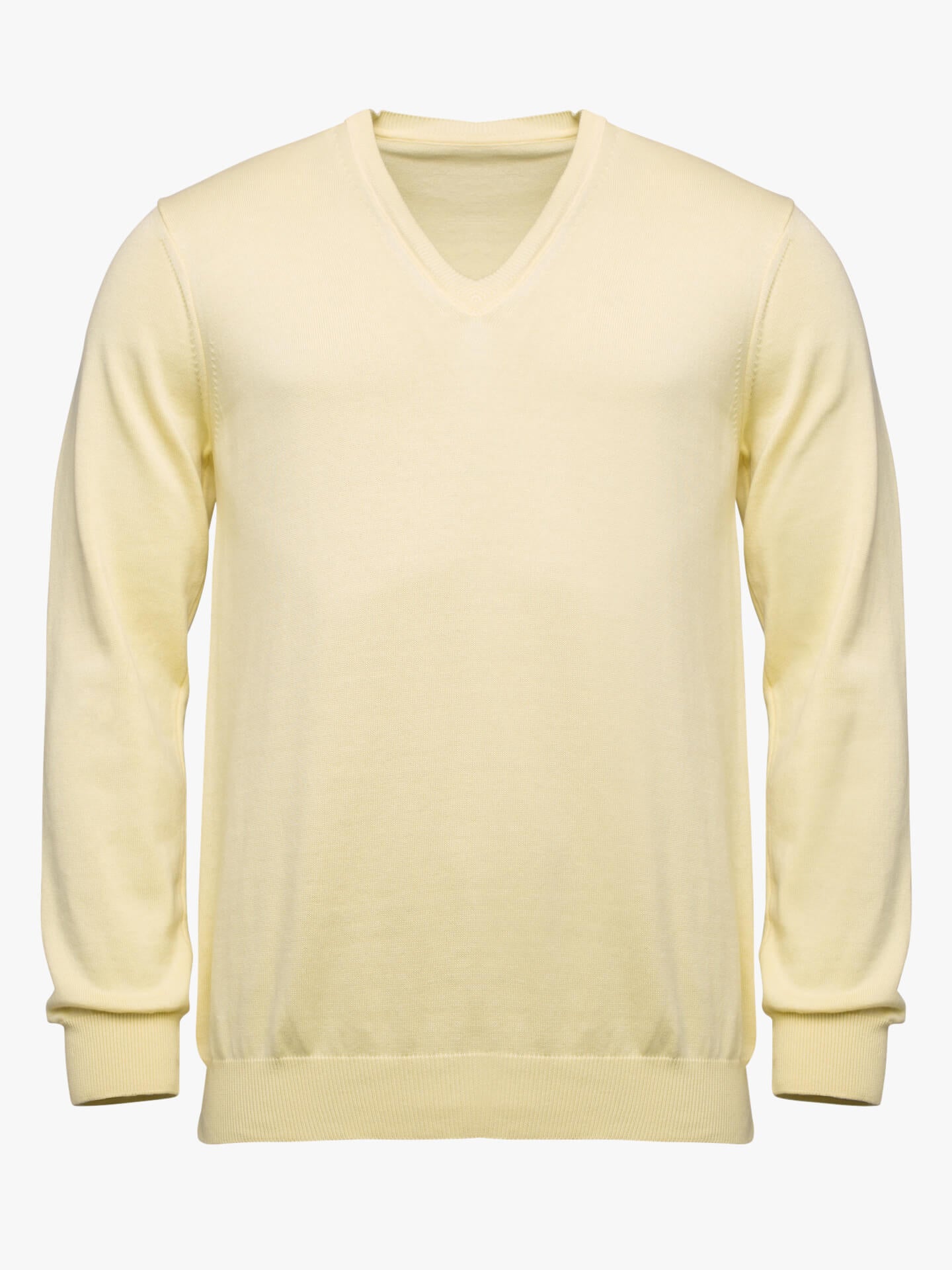 Camisola para homem amarela. Confecionada em tecido 100% algodão. Corte reto, gola em bico, manga comprida e acabamentos canelados