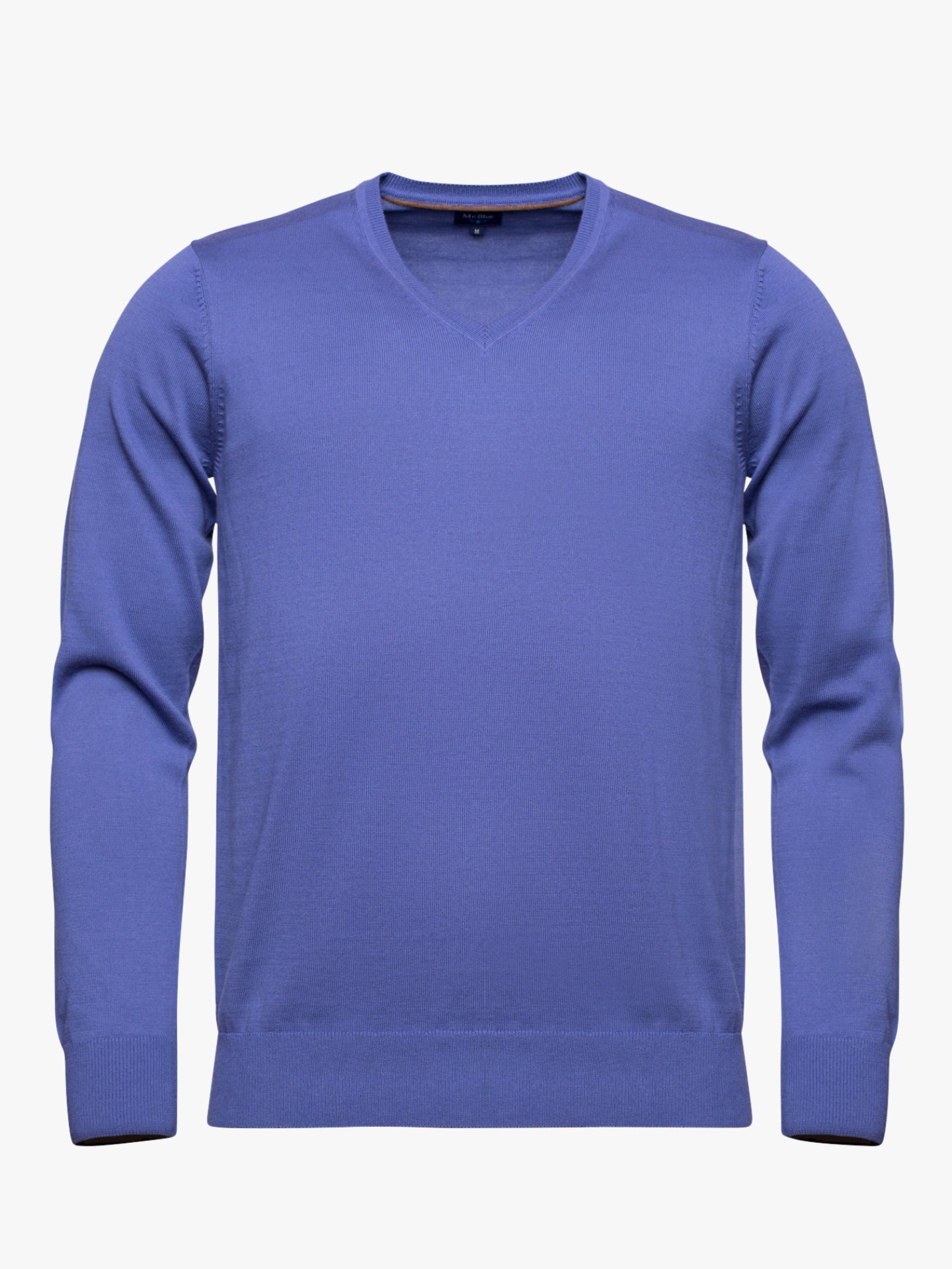 Camisola azul em algodão decote em V. Peça Indispensável no seu guarda roupa. Ideal para um fim de semana ou um dia de trabalho descontraído. Ideal para usar com uma camisa.