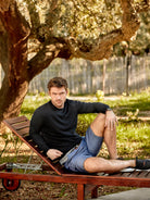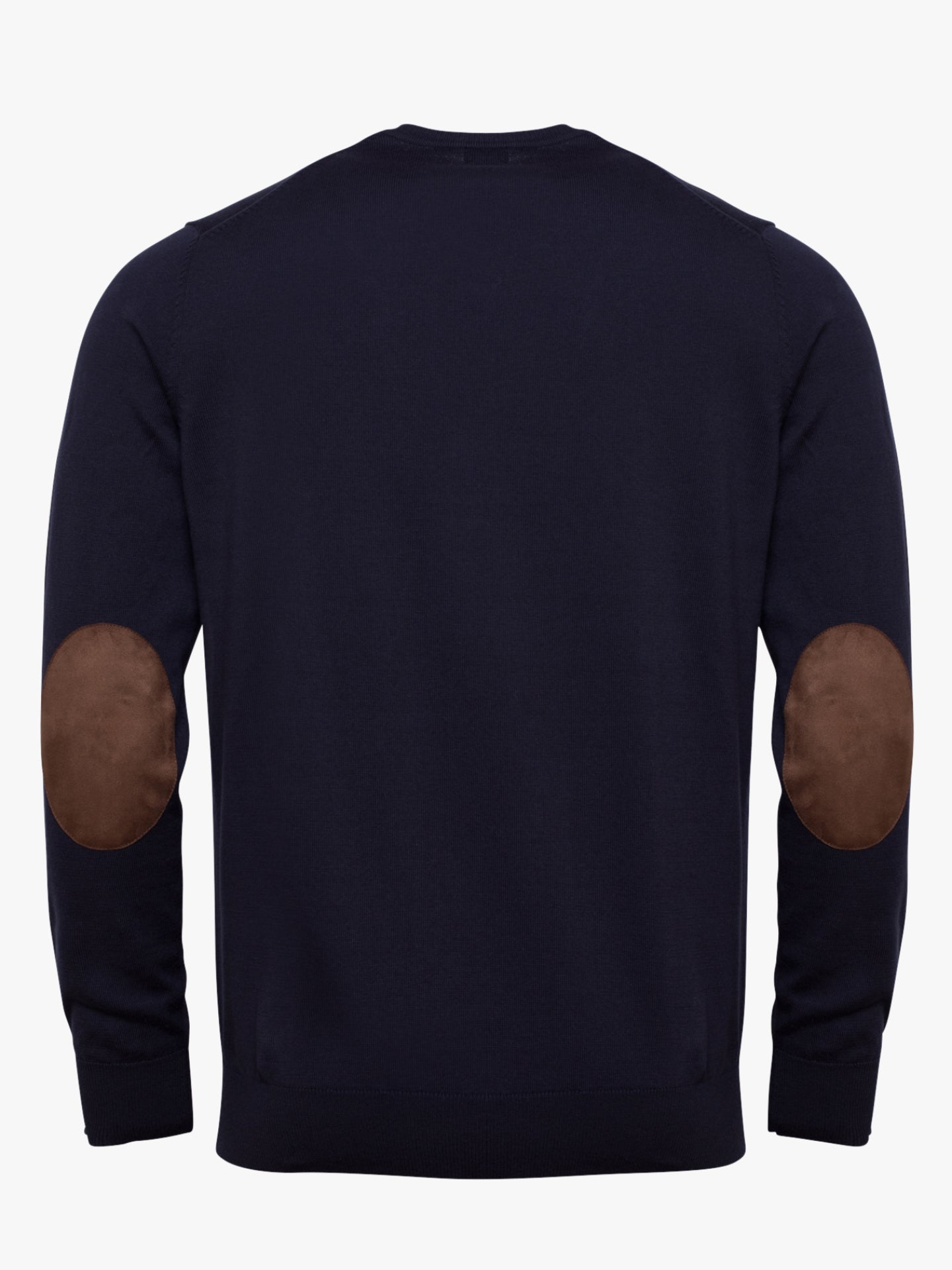 Camisola Homem algodão e caxemira azul escuro com cotoveleiras em camurça camel escuro. Peça indespensável no seu guarda roupa. Ideal para um fim de semana ou um dia de trabalho descontraído. Ideal para usar com uma Camisa Homem.