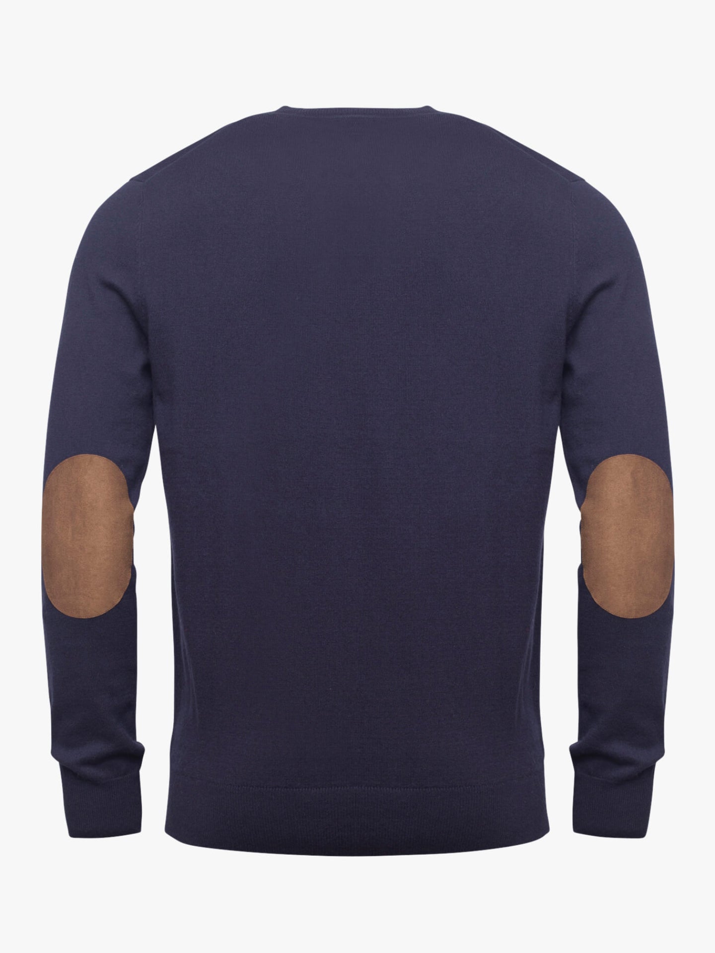 Camisola para homem azul escuro com cotoveleiras castanho. Confecionada em tecido de algodão e caxemira. Corte reto, gola em bico, manga comprida e acabamentos canelados