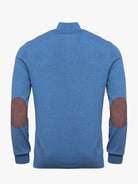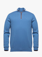 Camisola para homem gola com fecho de correr liso azul com cotoveleiras e detalhe fecho em castanho. Confecionada em tecido de algodão e caxemira. Corte casual, manga comprida e acabamentos canelados.