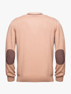 Cardigan para homem liso camel com fecho botões e pormenor linha viva e cotoveleiras em castanho escuro. Confecionado em tecido de algodão e caxemira. Corte casual, gola em bico, manga comprida e acabamentos canelados.