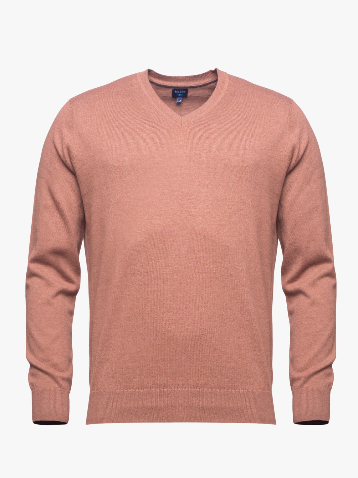 Camisola para homem camel escuro. Confecionada em tecido de algodão e caxemira. Corte reto, gola em bico, manga comprida e acabamentos canelados