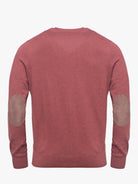 Camisola para homem laranja tijolo com cotoveleiras em castanho. Confecionada em tecido de algodão e caxemira. Corte reto, gola em bico, manga comprida e acabamentos canelados