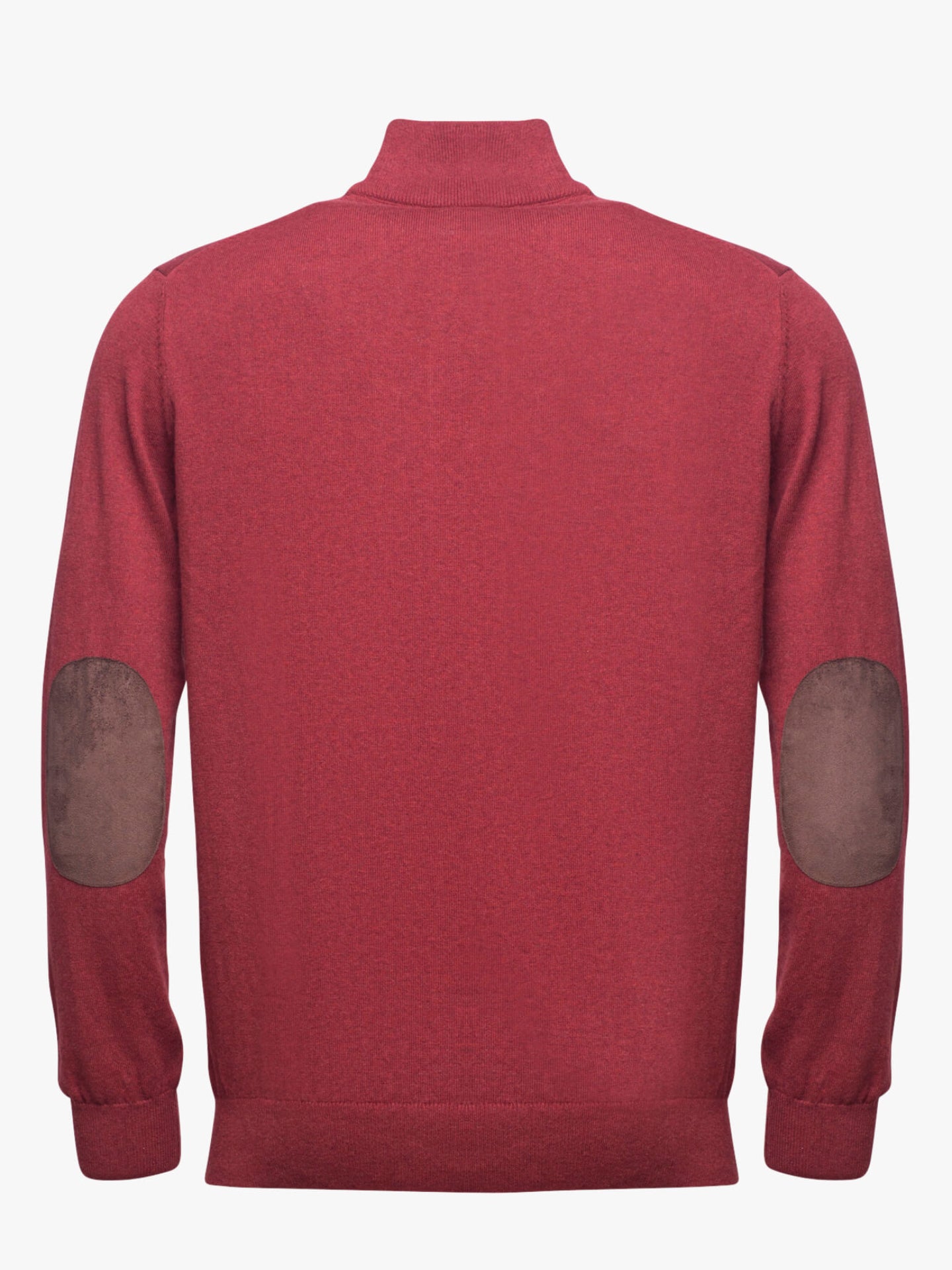Camisola para homem gola com fecho de correr liso vermelho médio com cotoveleiras e detalhe carcela em castanho. Confecionada em tecido de algodão e caxemira. Corte casual, manga comprida e acabamentos canelados.