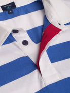 Rugby às riscas azul e branco de homem manga curta com logo em azul. Carcela e colarinho em branco com detalhe em vermelho.