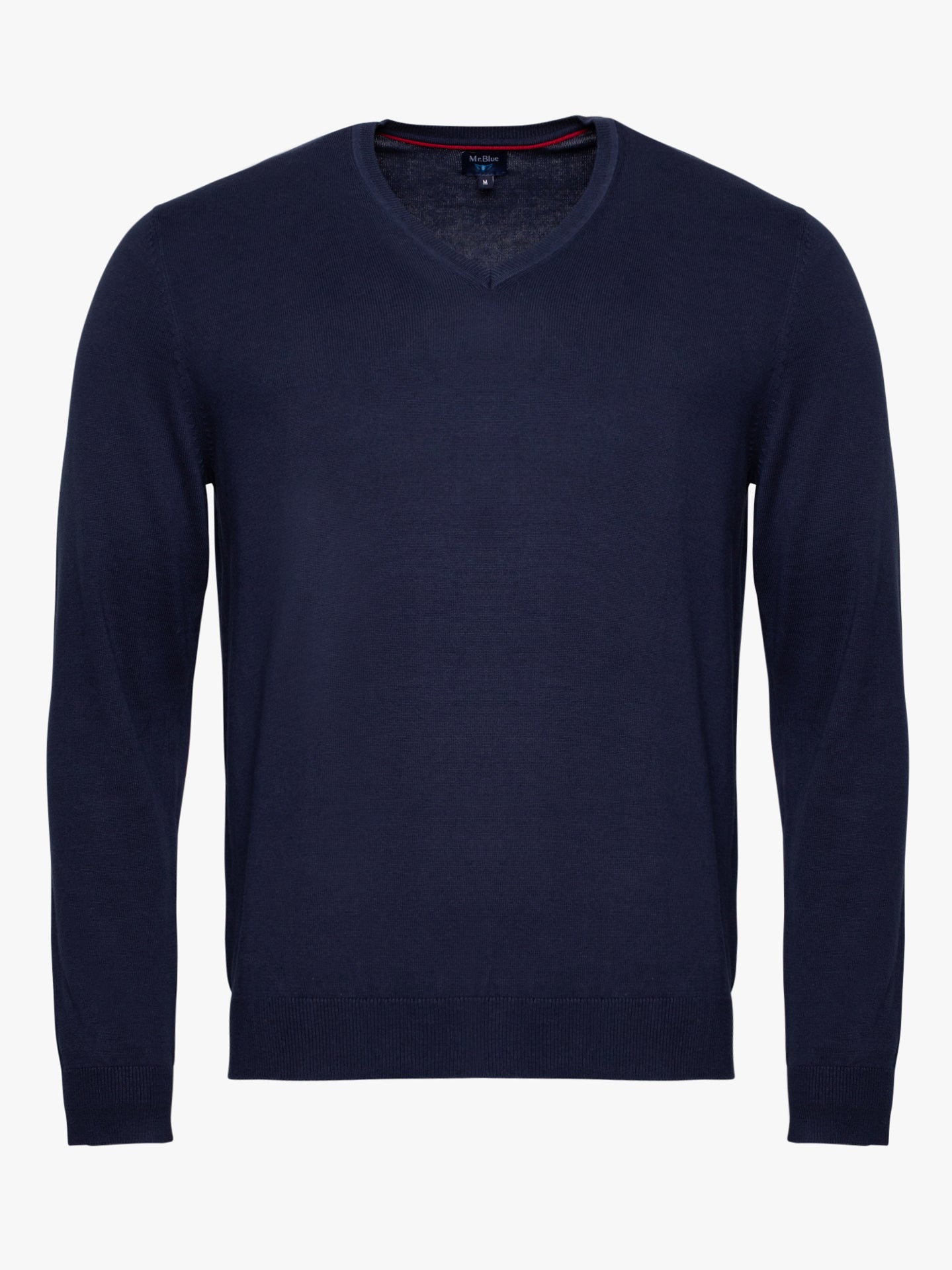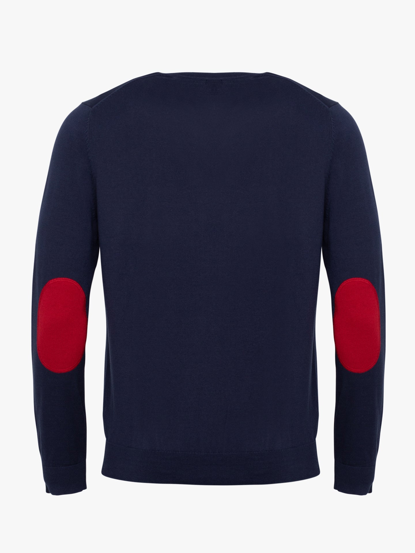 Pullover de Algodão azul escuro decote em V com cotoveleiras vermelho para homem