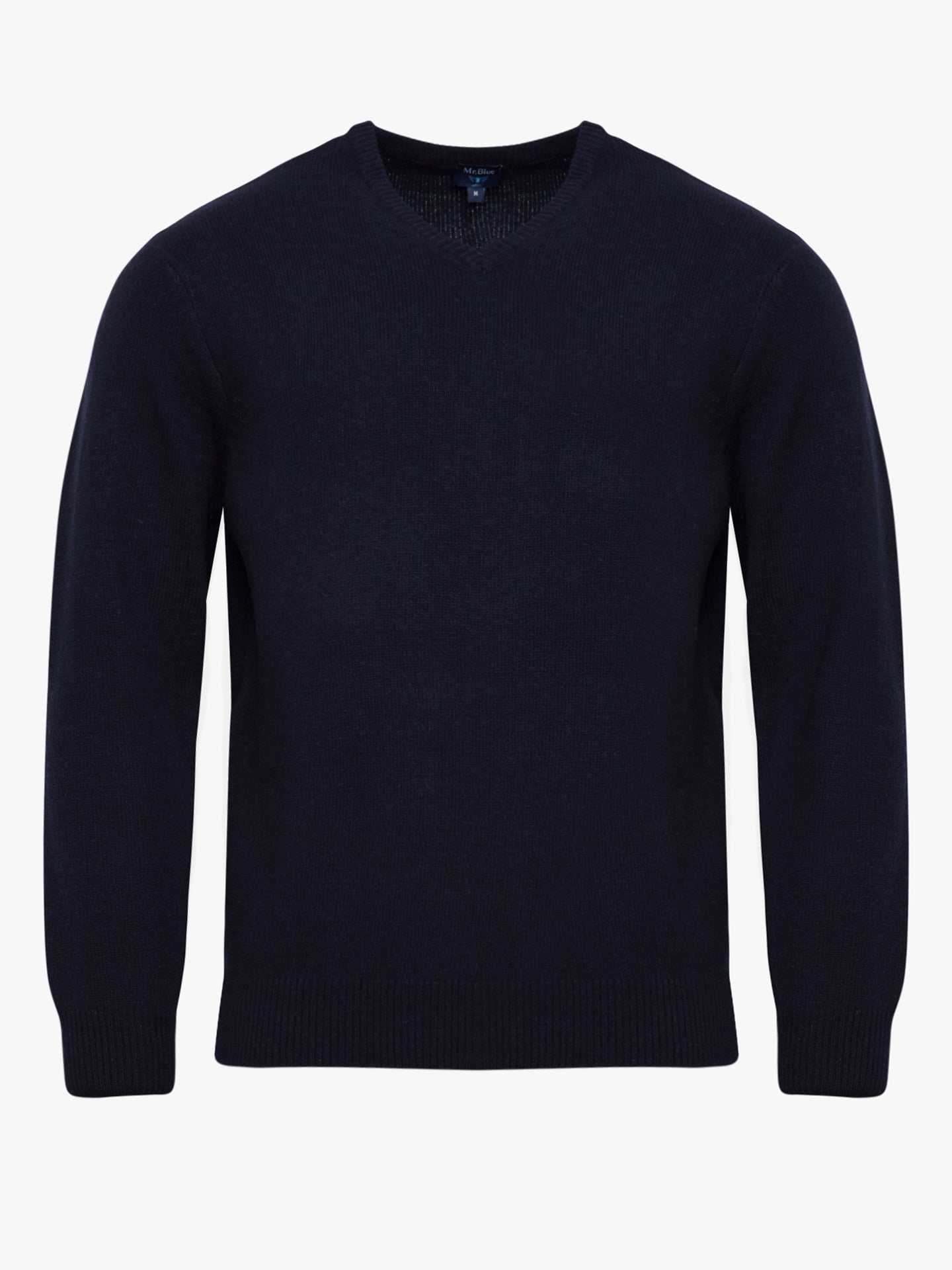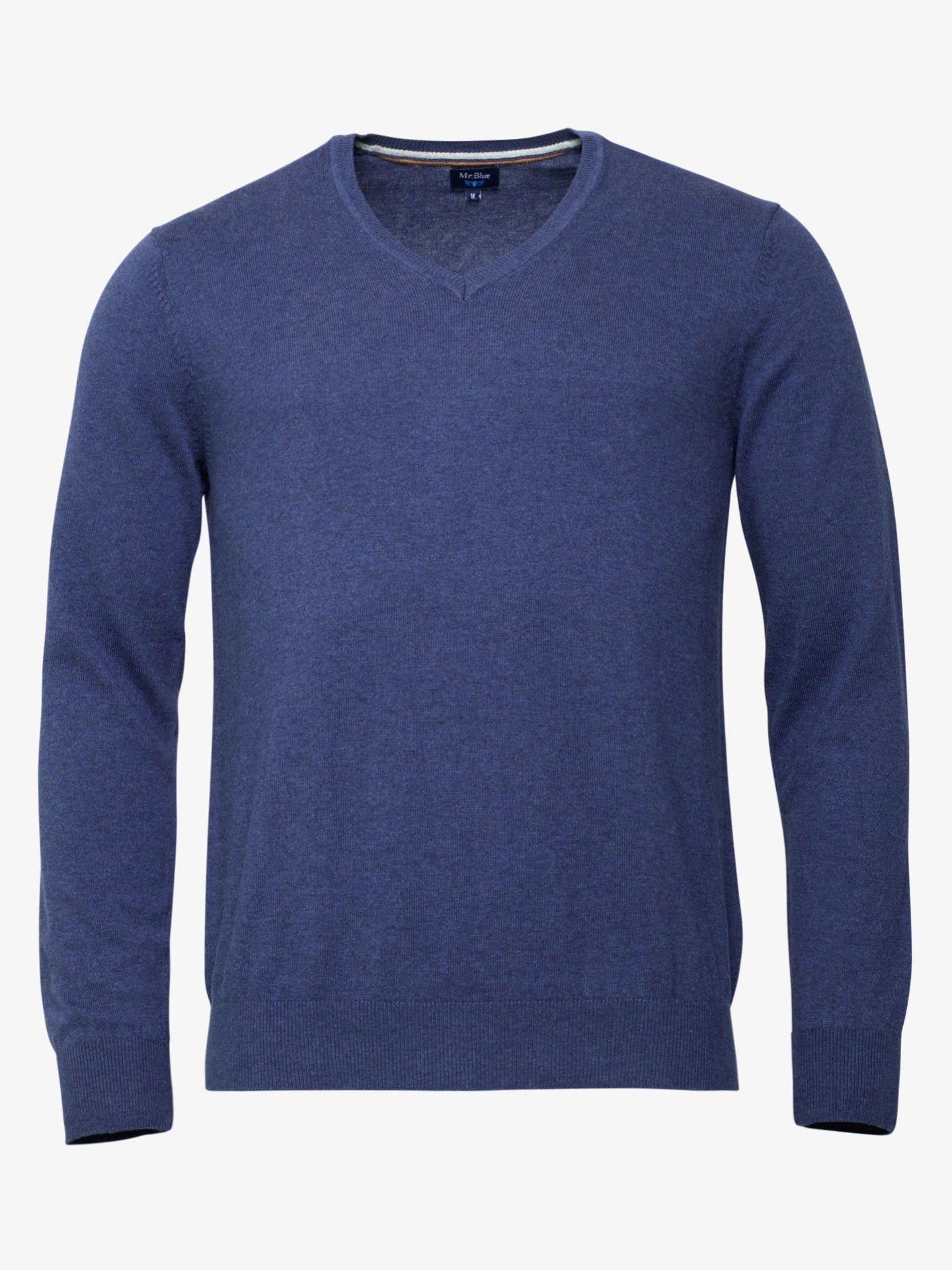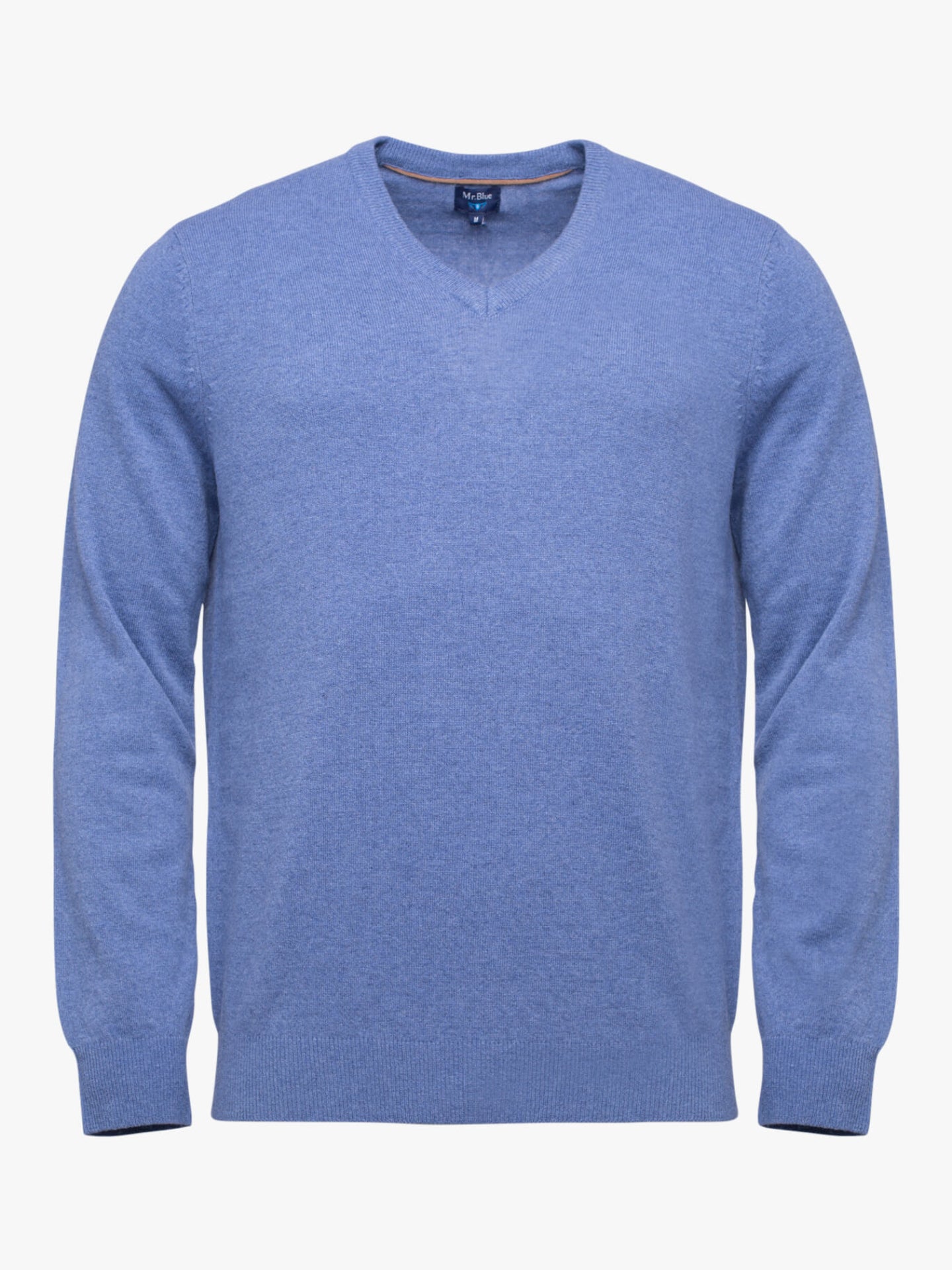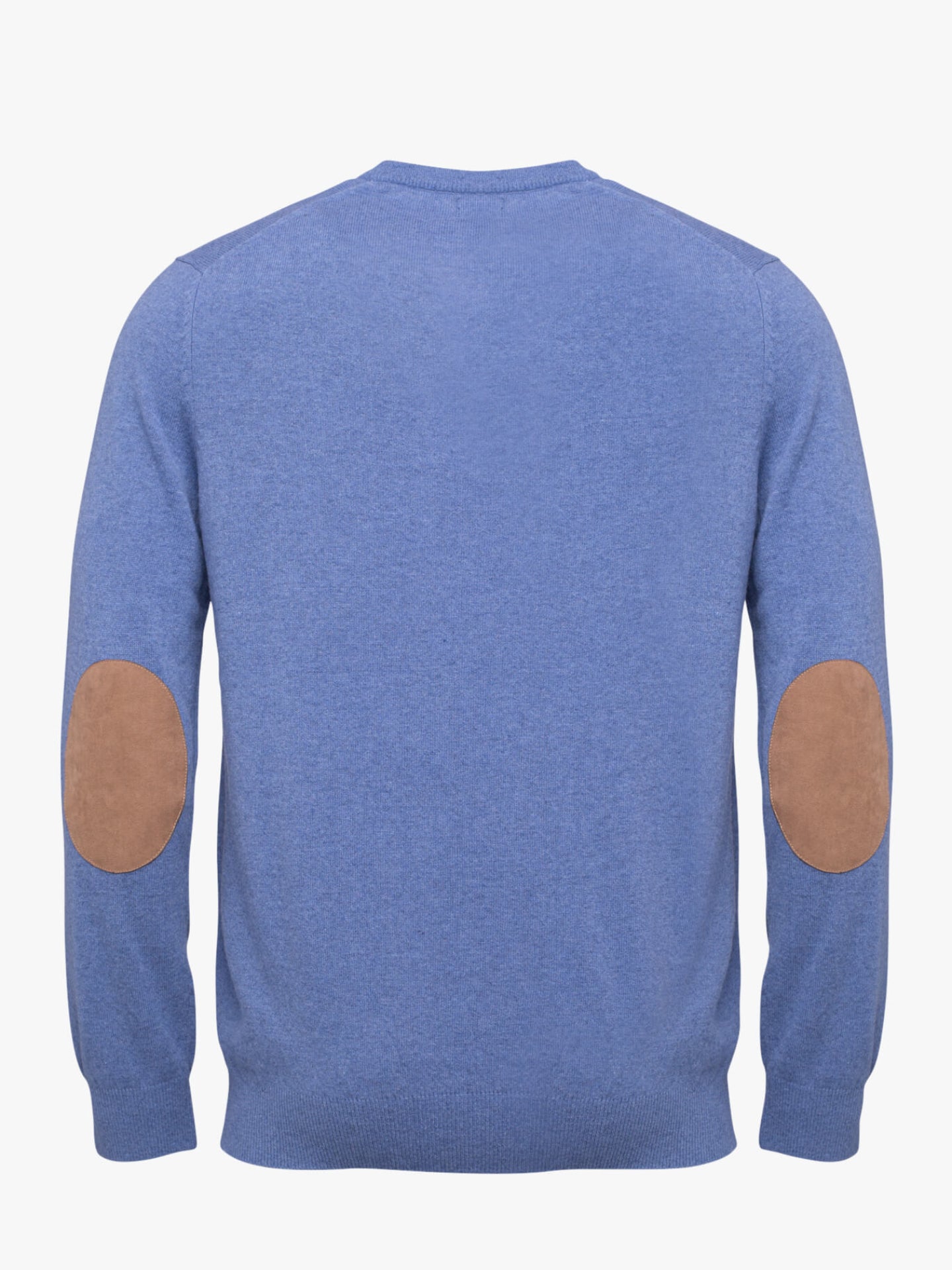 Camisola lã azul médio decote em bico com cotoveleiras