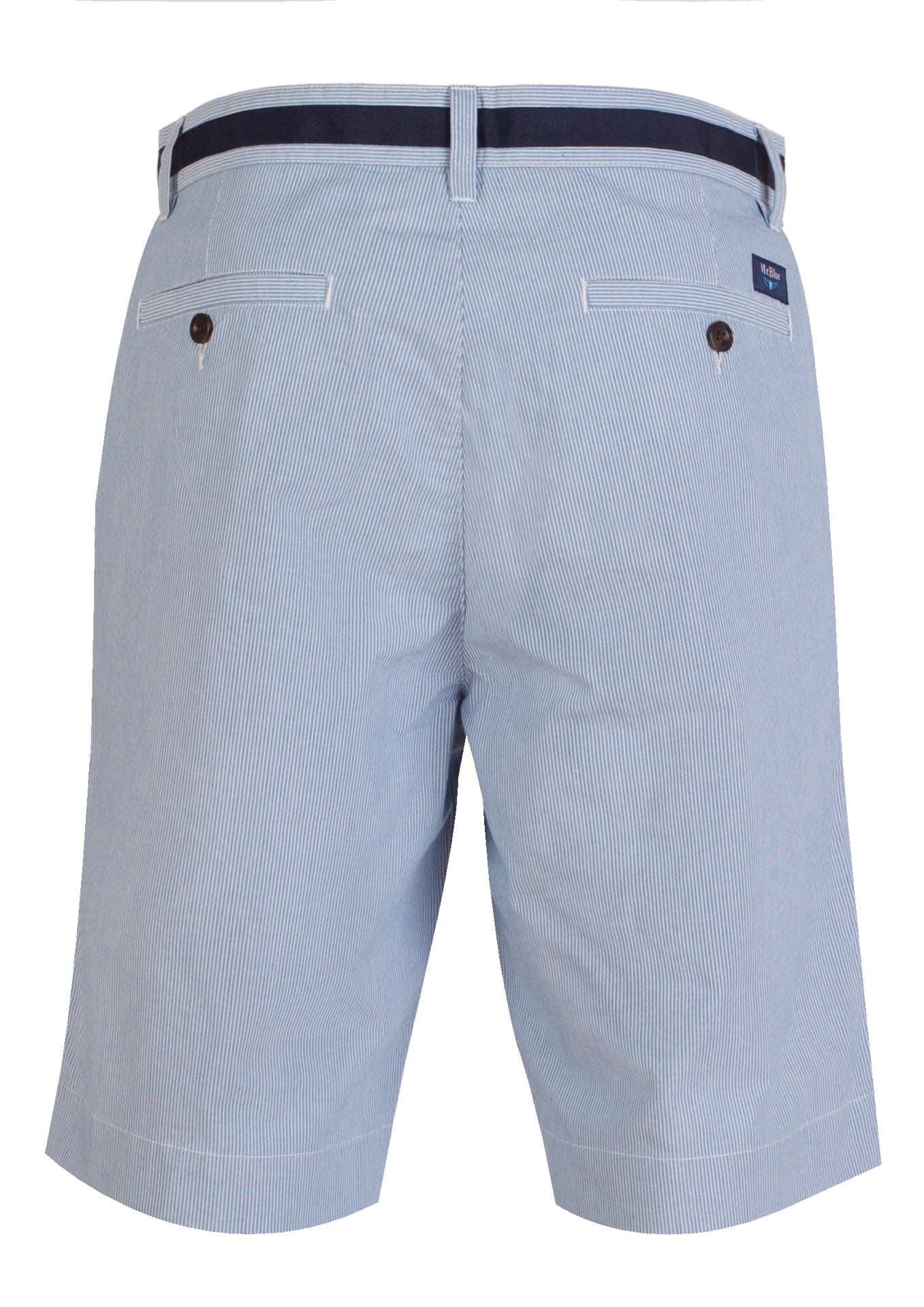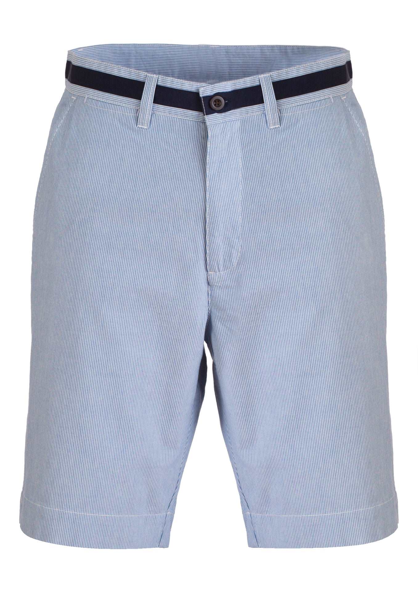 Bermudas Homem 100% Algodão Oxford riscas finas azul claro e branco com tape no cós em azul marinho Ideais para dias mais quentes ou para fim-de-semana descontraído