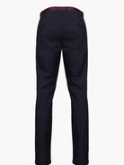 Calças Chinos Homem 100% Algodão com estrutura canelada azul escuro com tape no cós em bordeaux e tape interior cós em pesponto vermelho. Corte Tailored Fit. Muito confortáveis, são a escolha certa para os dias mais quentes.