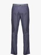 Calças Chinos Homem 100% Algodão Oxford Slim Fit azul denim com tape no cós em branco e azul marinho. Interior cós mil raias e riscas azul e branco. Corte Tailored Fit. Muito confortáveis, são a escolha certa para os dias mais quente