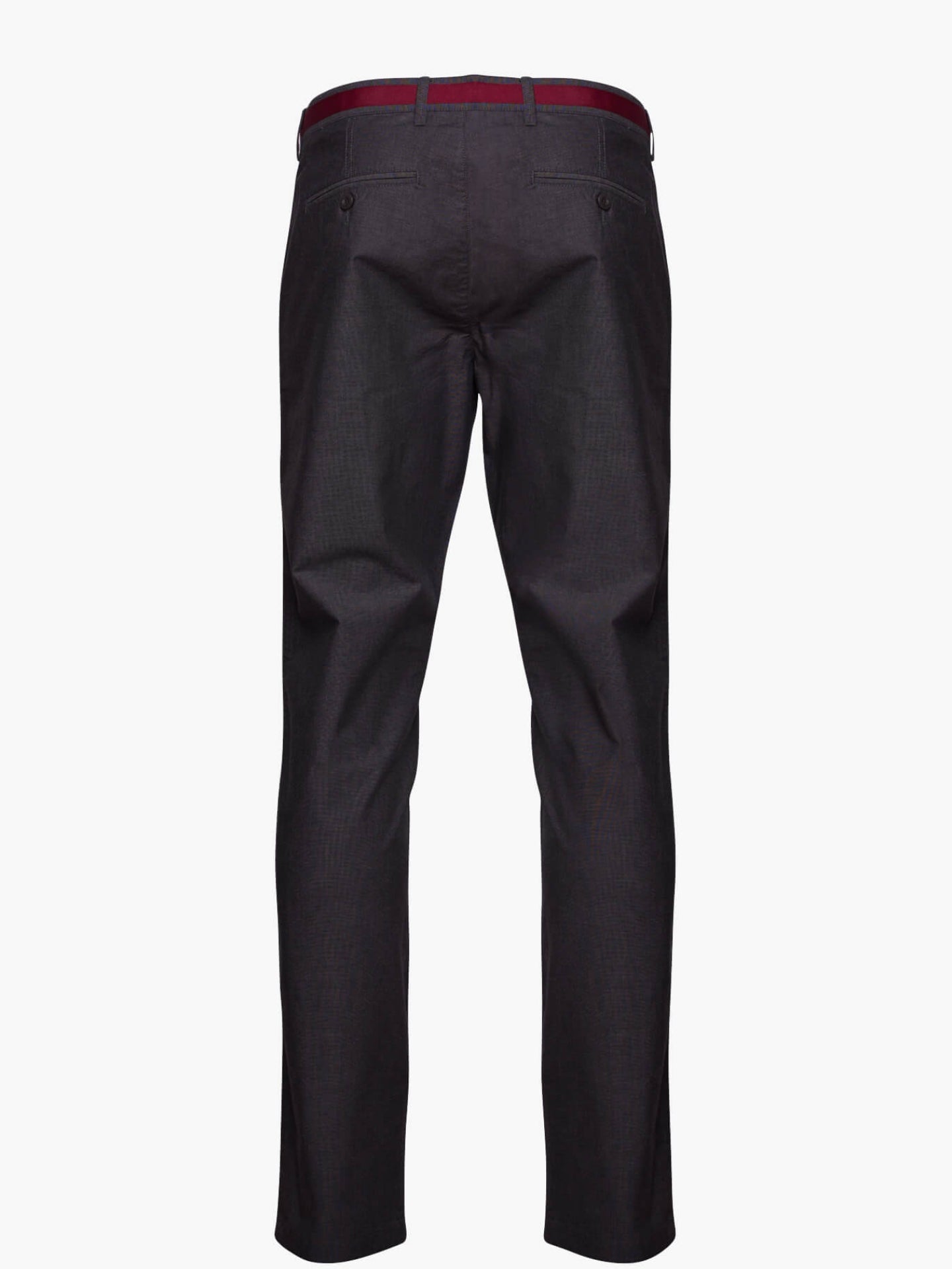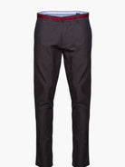 Calças Chinos Homem 100% Algodão Fil-a-fil cinzento com tape no cós em bordeaux. Interior cós mil raias e riscas azul e branco. Corte Tailored Fit. Muito confortáveis, são a escolha certa para os dias mais quentes.