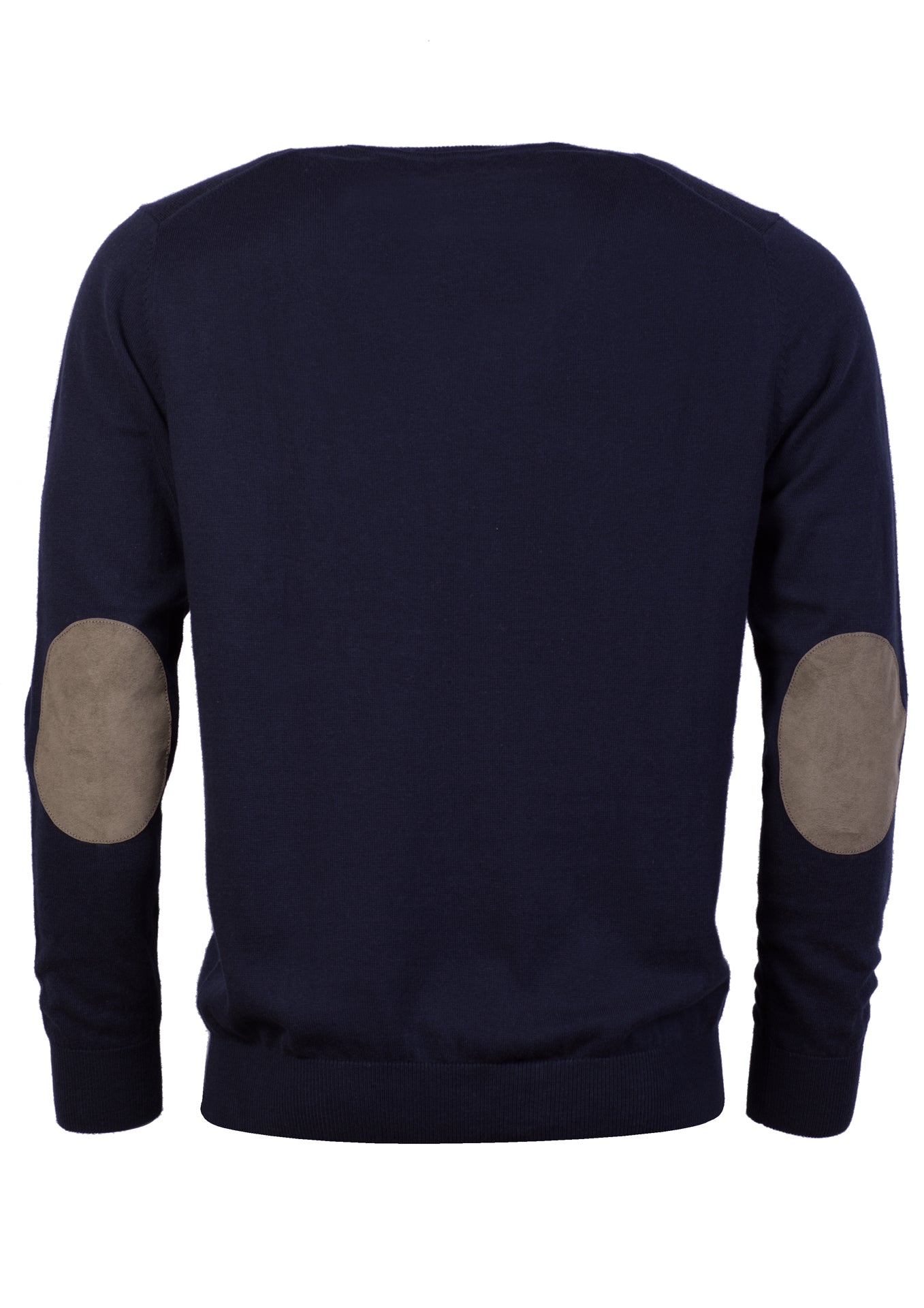 Pullover Homem algodão e caxemira decote em V azul escuro com interior colarinho e cotoveleiras em camurça camel. Peça indespensável no seu guarda roupa. Ideal para um fim de semana ou um dia de trabalho descontraído. Ideal para usar com uma Camisa Homem.