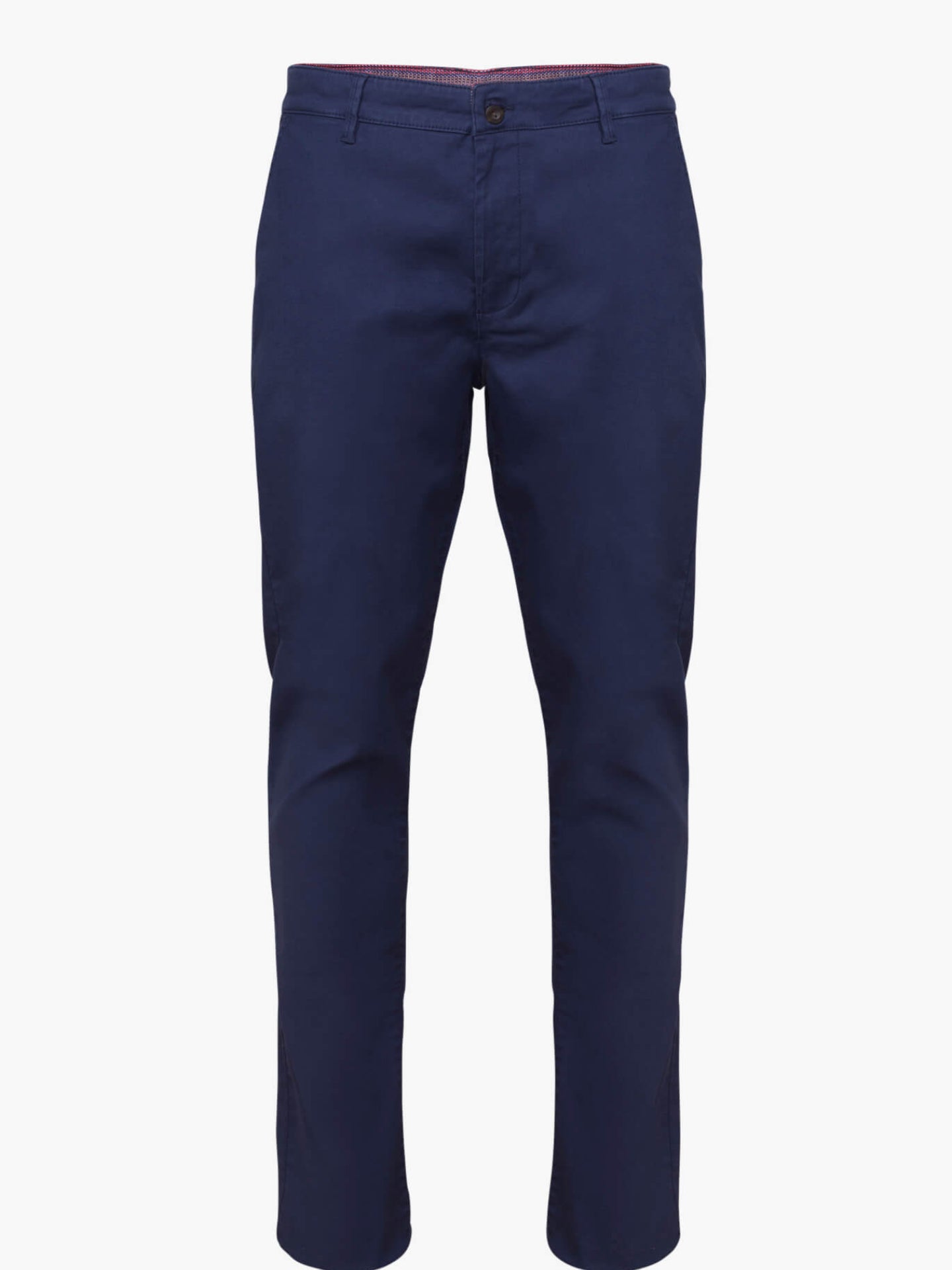 Calças chino para homem azul intermédio confecionadas em tecido algodão. Corte slim, fecho de botão e fecho de correr oculto por carcela, dois bolsos laterais, dois bolsos com casa de botão abotoados atrás e presilhas para cinto. Interior cós com padrão.