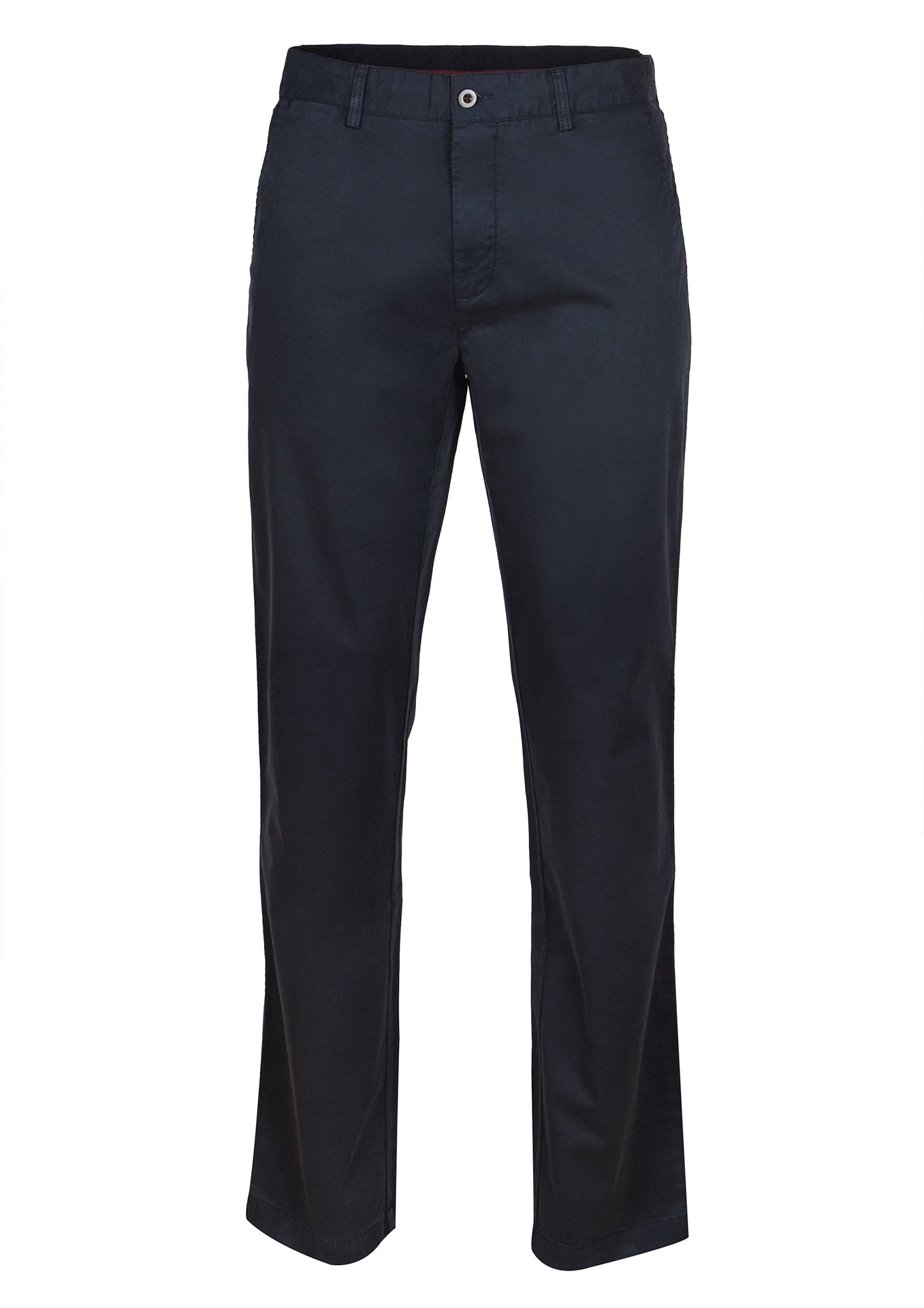Calças chino para homem azul intermédio confecionadas em tecido algodão. Corte regular, fecho de botão e fecho de correr oculto por carcela, dois bolsos laterais, dois bolsos com casa de botão abotoados atrás e presilhas para cinto. Interior cós com padrã