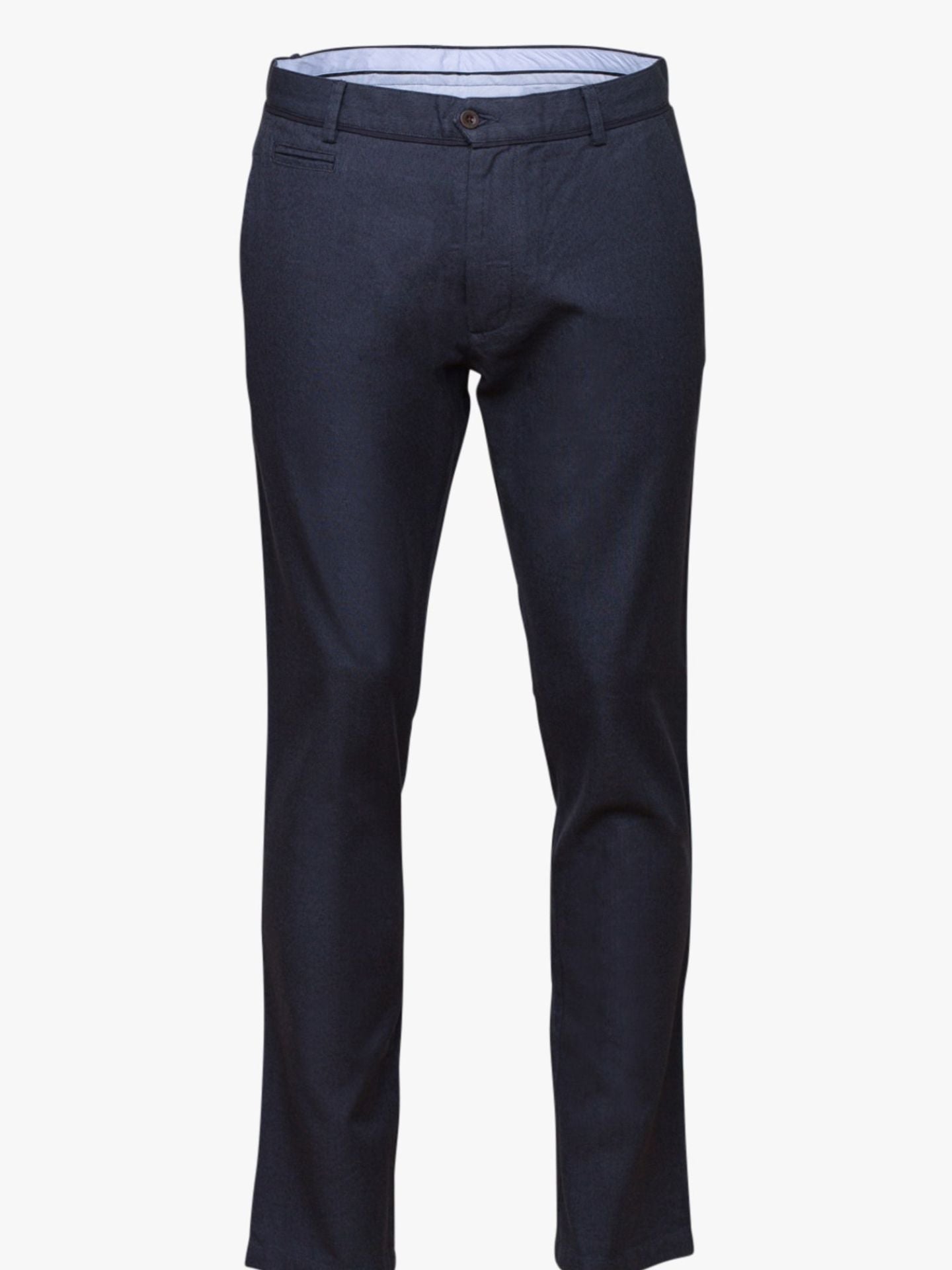 Calças Chino com estrutura Slim Fit lisas. Carcela com fecho de correr oculto, 2 bolsos laterais, 1 bolso porta-moedas, 2 bolsos de ilhós abotoado na parte posterior e presilhas para o cinto. Muito confortável e versátil. É a escolha ideal para um dia de