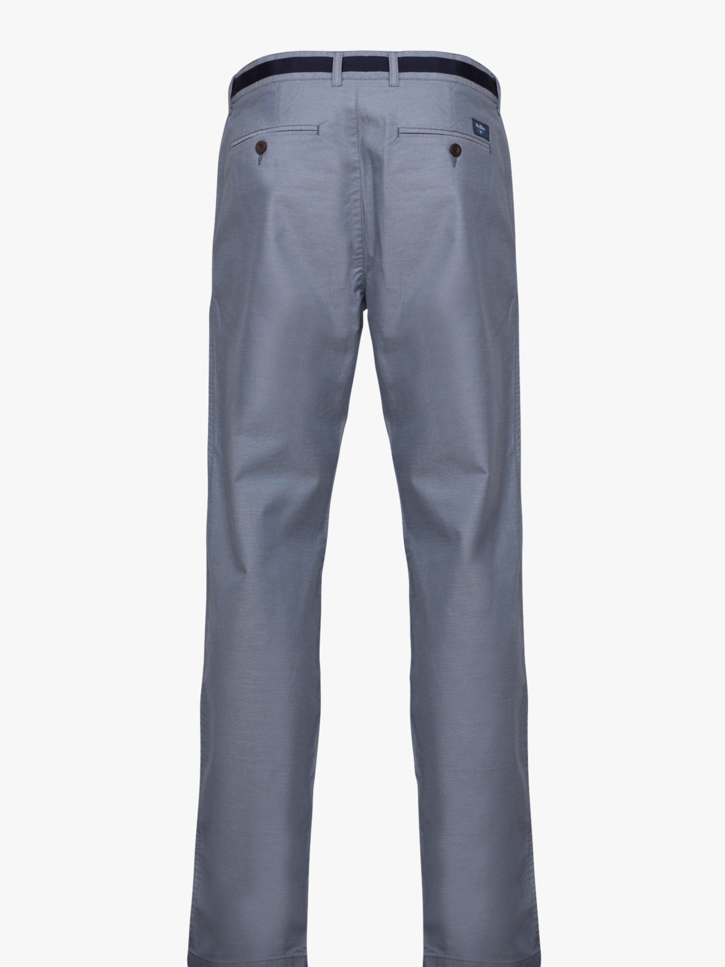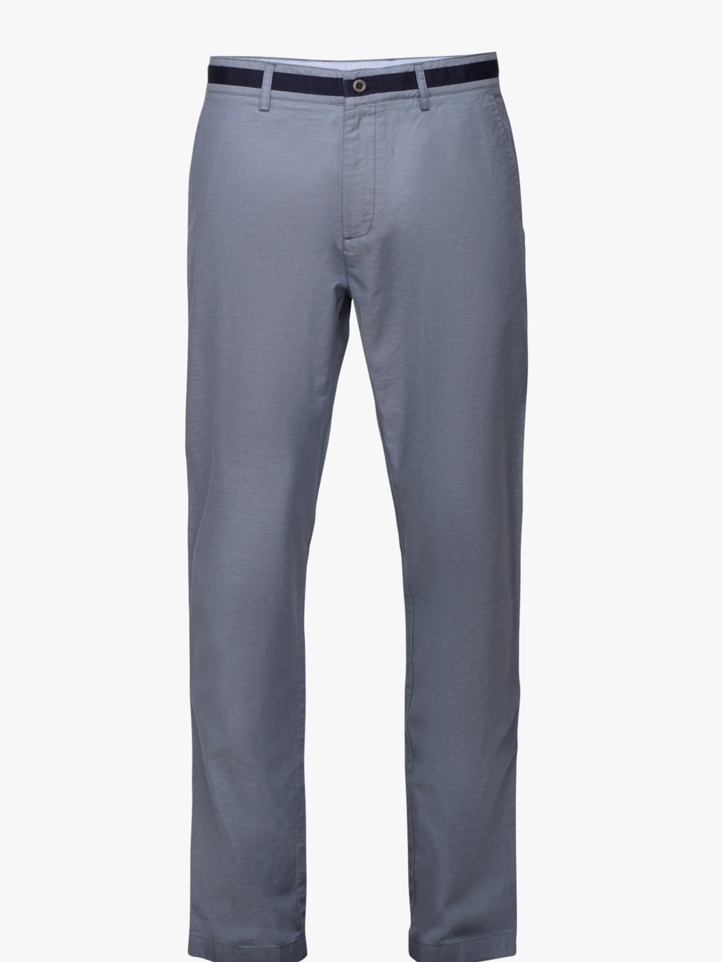 Calças Chinos Homem 100% Algodão Oxford azul médio com tape no cós em azul marinho. Corte Tailored Fit. Muito confortáveis, são a escolha certa para os dias mais quentes.