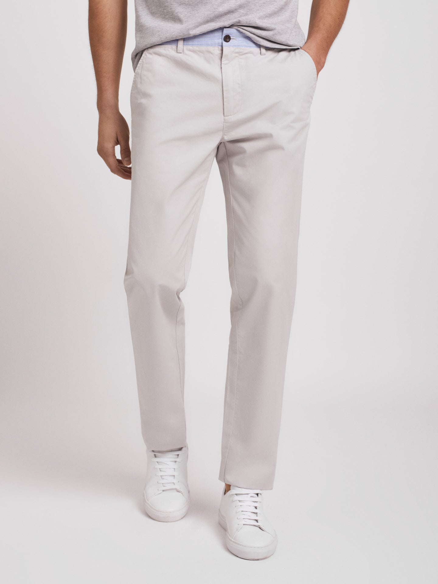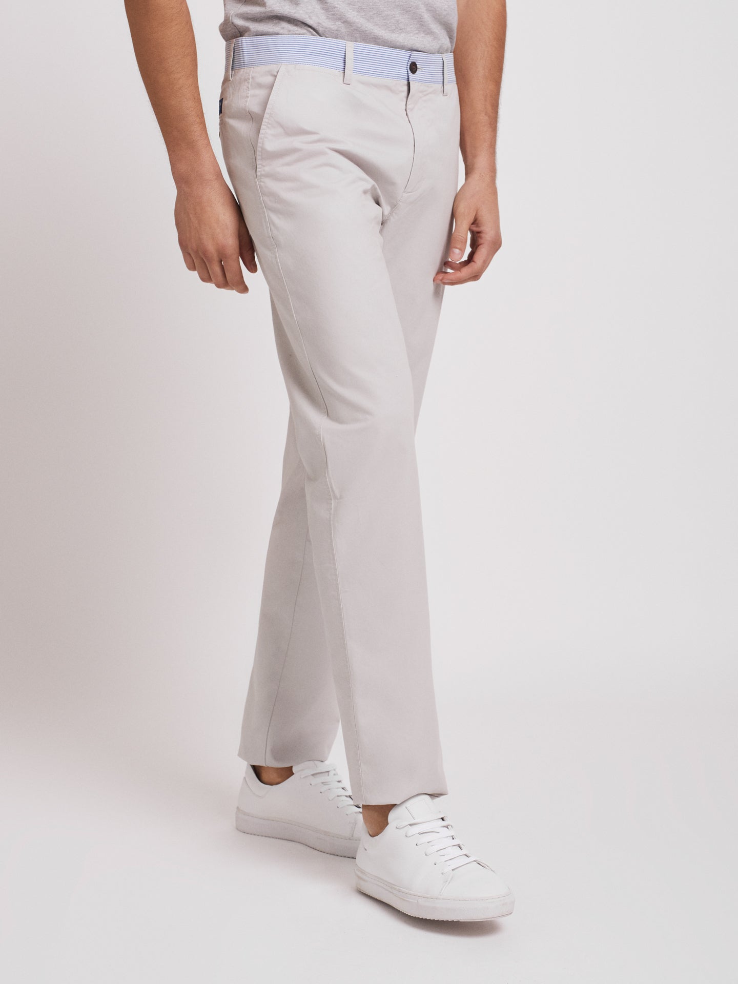 Calças Chino bege claro homem 100% algodão. Cós às riscas azuis e brancas. Corte regular, fecho de botão e fecho de correr oculto por carcela, dois bolsos laterais e um bolso pequeno. Dois bolsos com casa de botão abotoados atrás e presilhas para cinto.