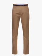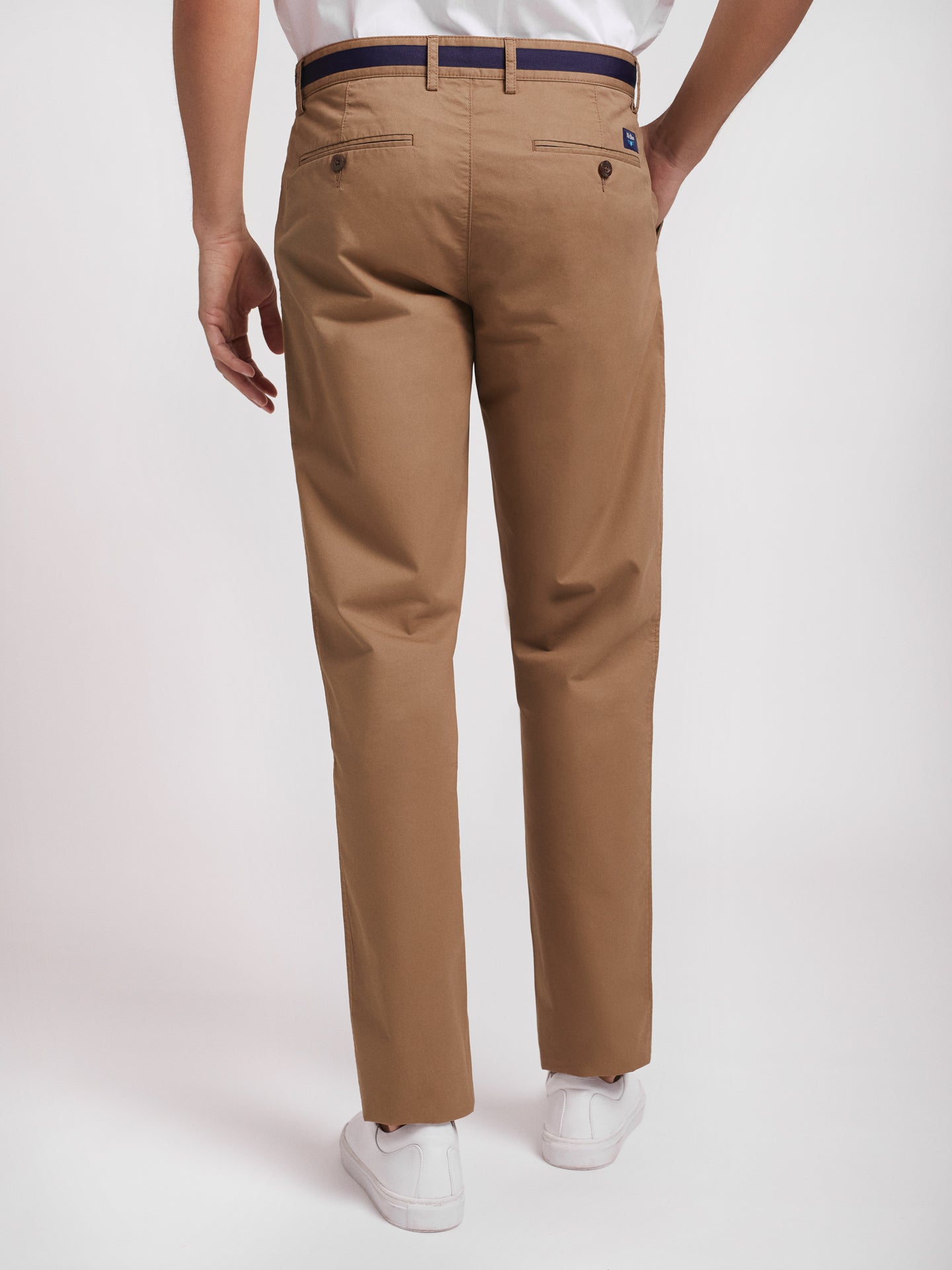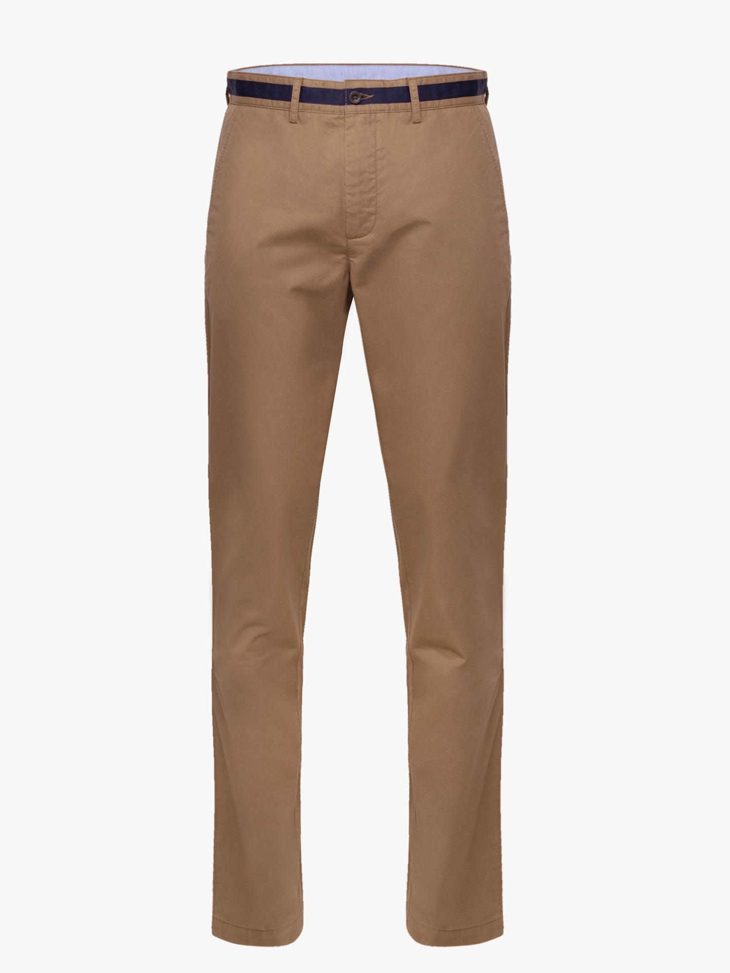Calças Chino camel homem 100% algodão. Tape no cós azul marinho. Corte regular, fecho de botão e fecho de correr oculto por carcela, dois bolsos laterais e um bolso pequeno. Dois bolsos com casa de botão abotoados atrás e presilhas para cinto.