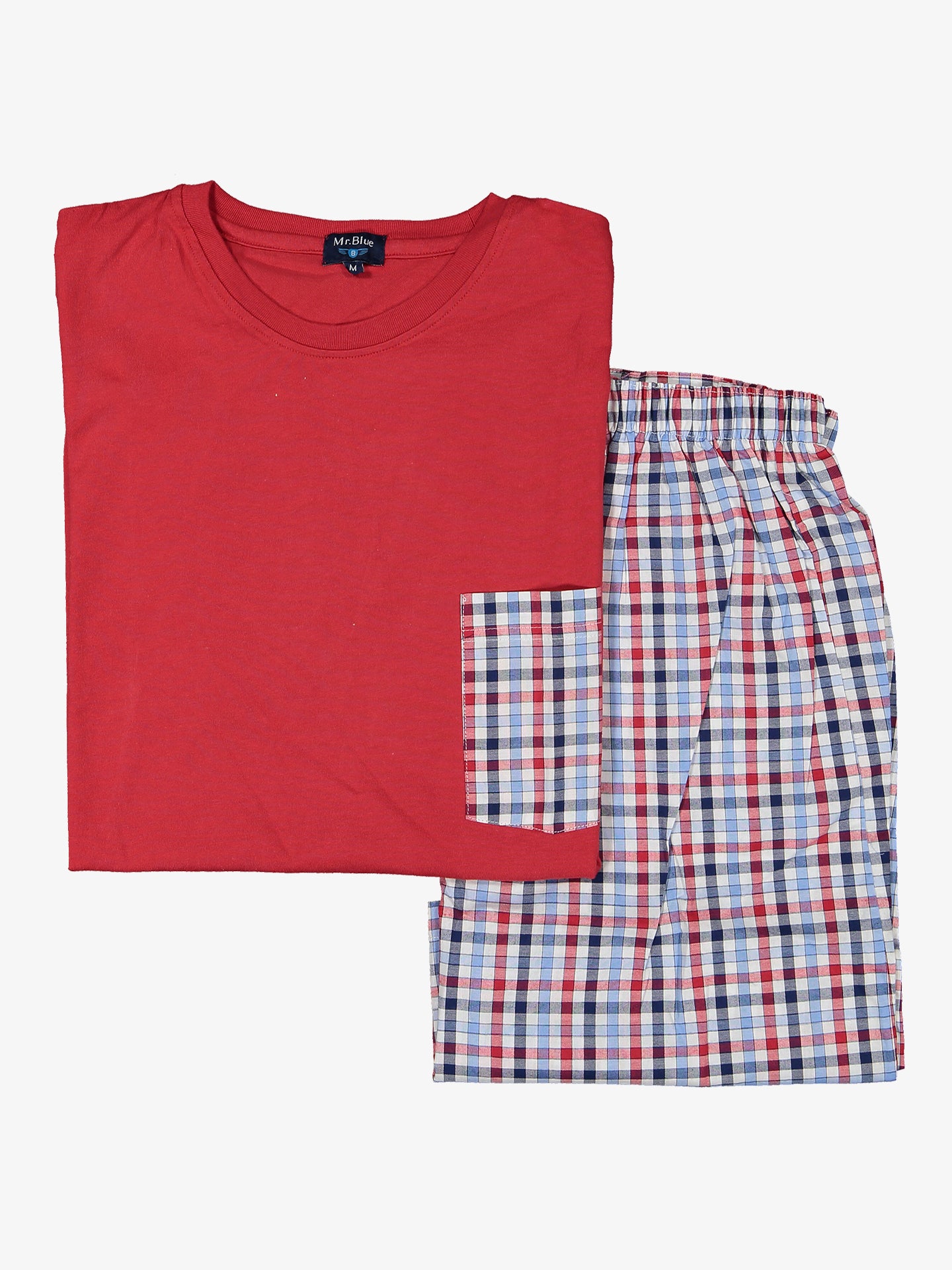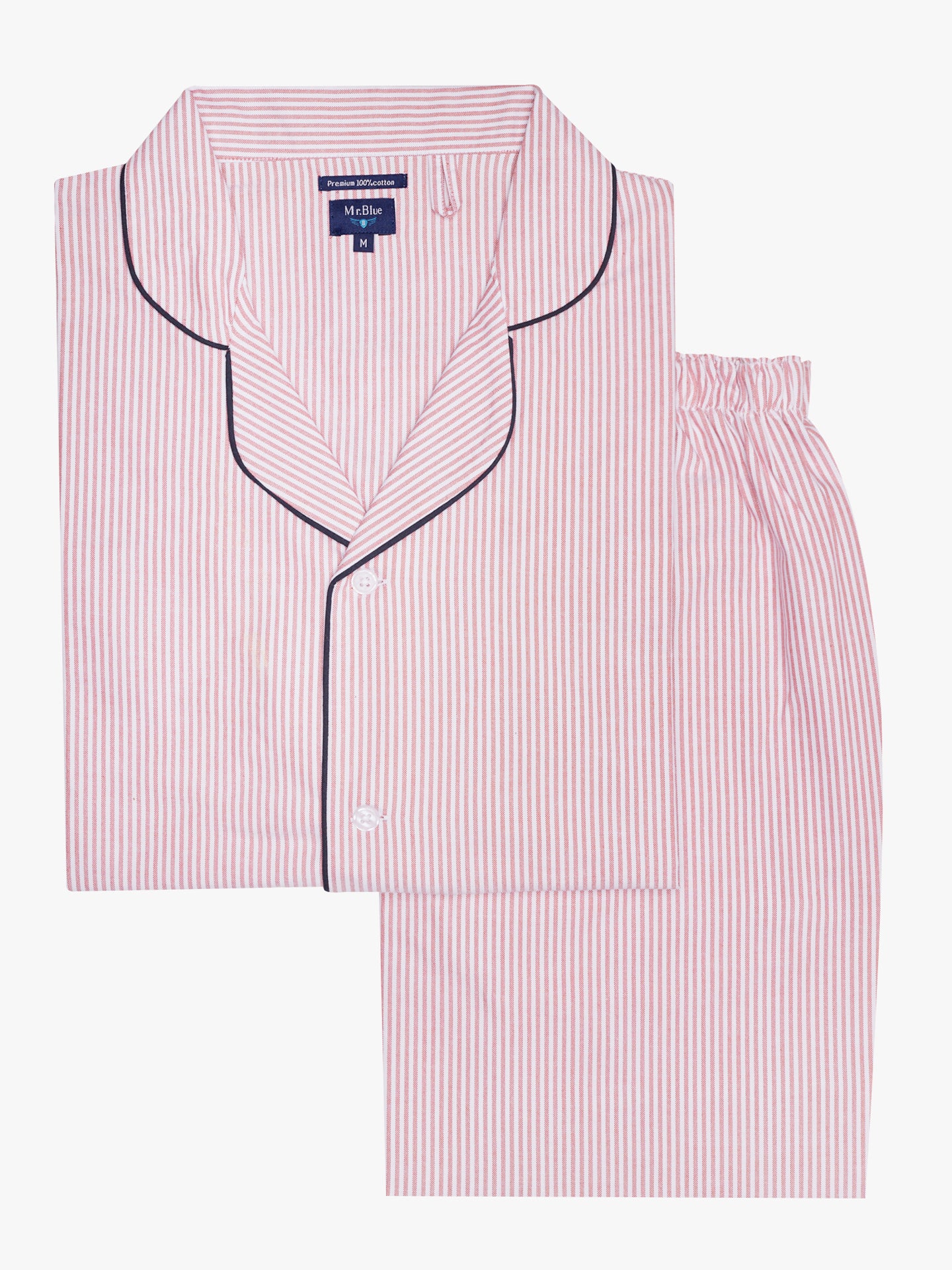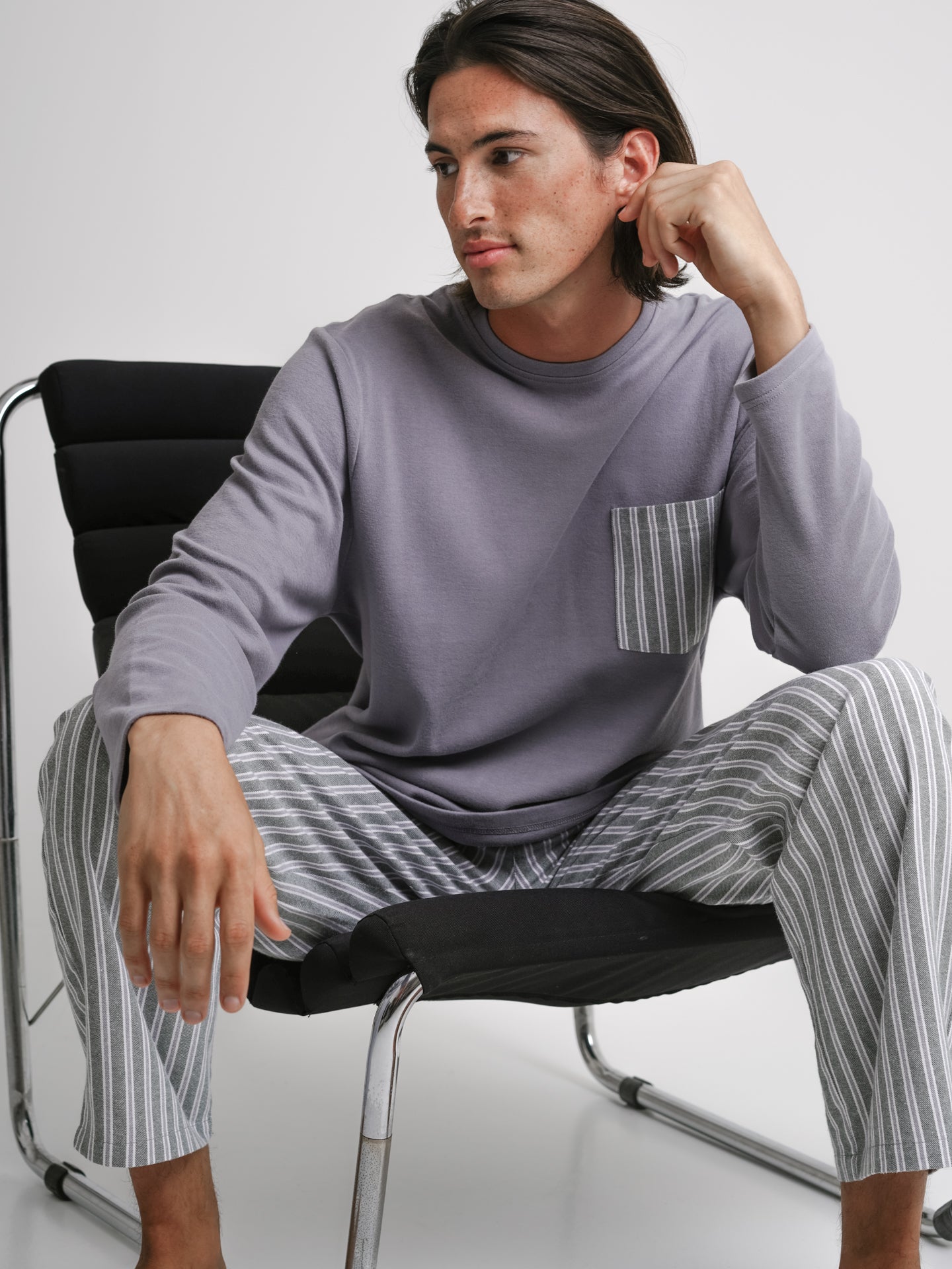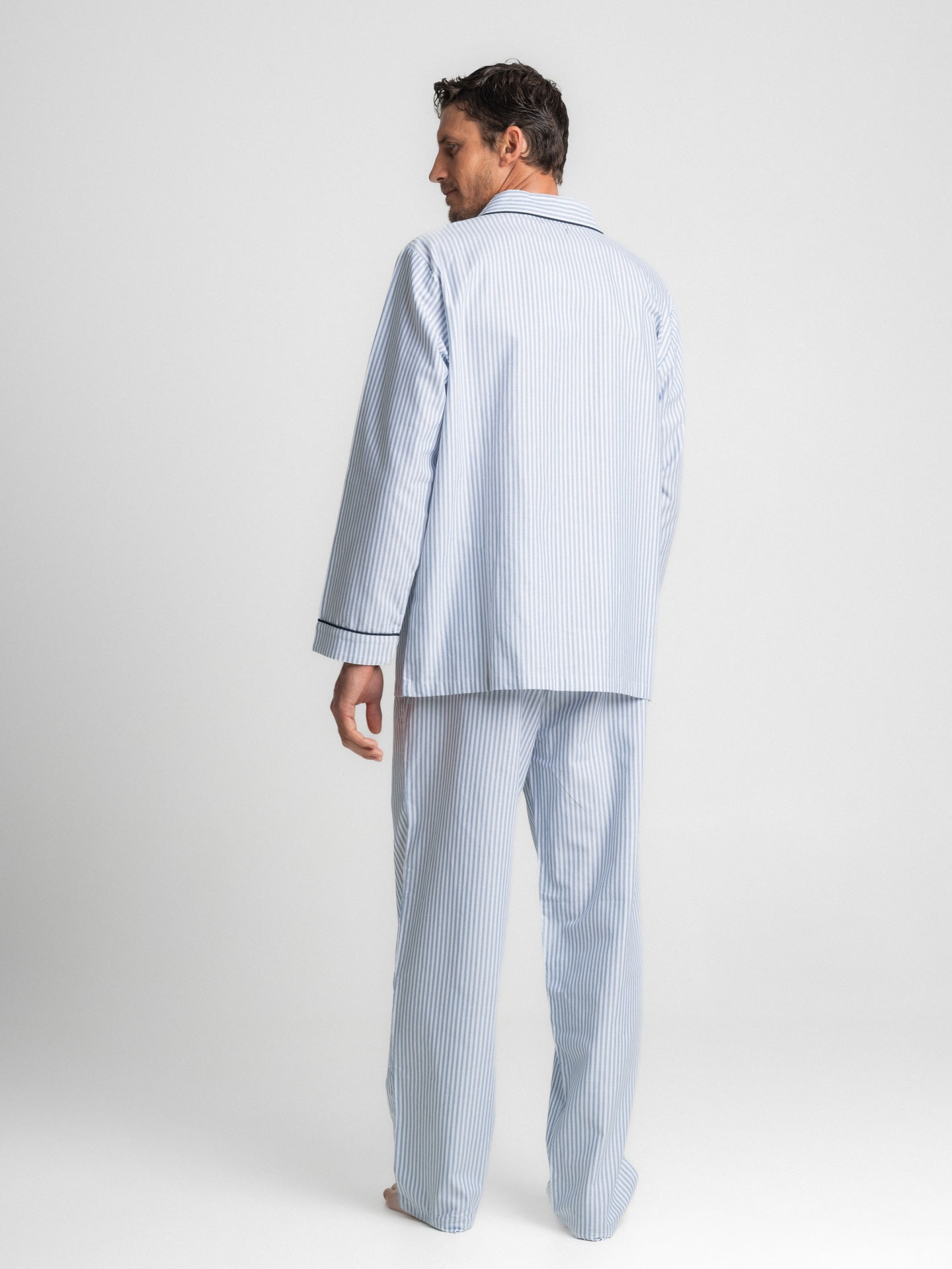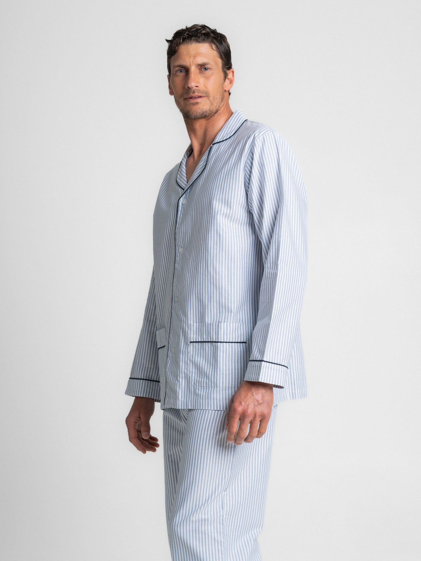 Pijama clássico manga comprida de riscas finas azul claro e branco
