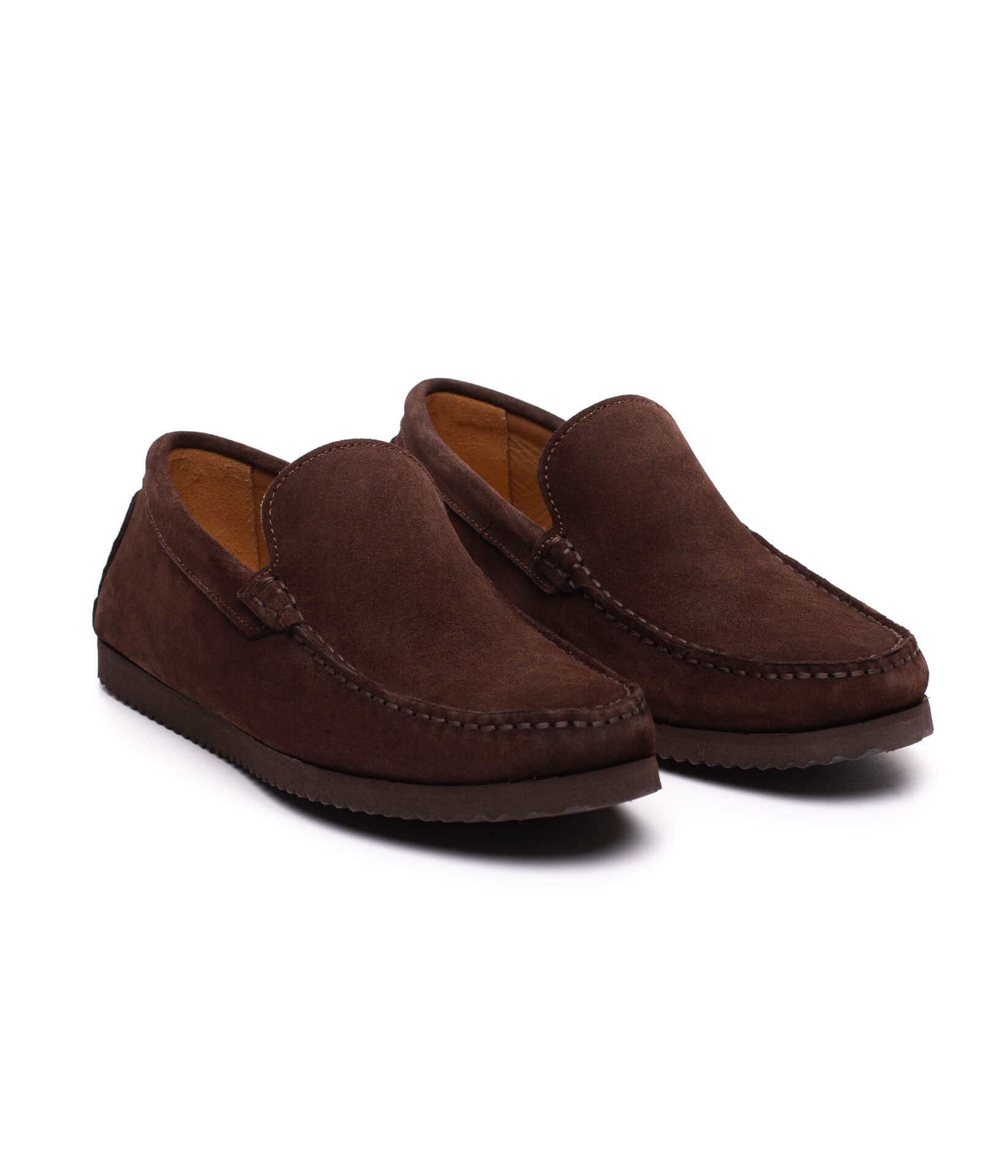 Um clássico desportivo para os apreciadores de sapatos sem atacadores. Este modelo venitian é feito a partir de camurça castanho escuro com sola de borracha e é o modelo que vai querer usar nos dias mais quentes.